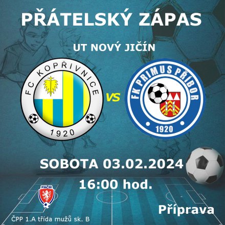 V sobotu 3.2.2024 nás čeká na UT v Novém Jičíně další přípravný zápas. Od 16:00 hod se utkáme s týmem FK Primus Příbor.
