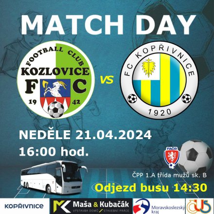 Další venkovní zápas, tentokrát proti FC Kozlovice. Bus i pro fanoušky odjíždí v 14:30 hod od fotbalového stadionu se zastávkou u KB.