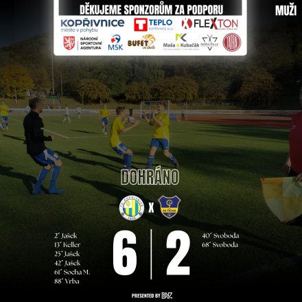 Střelci domácích branek : Jan Jašek 3, Patrik Keller 1, Marek Socha 1 a Patrik Vrba 1. Děkujeme fanouškům za krásnou fotbalovou atmosféru.