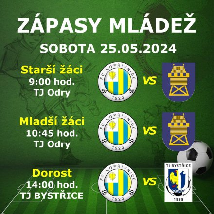 ⚽ Víkendový program mládeže. 💛💙 V sobotu nás čekají v kategoriích mládeže dva soupeři. Jsou to TJ Odry a TJ Bystřice. 🚷 Vzhledem k rekonstrukci tribuny bude pohyb v areálu omezen. Omlouváme se za komplikace.
